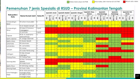 Nakes mencukupi std PMK Ada nakes, blm memenuhi std PMK Belum ada nakes Pemenuhan 7 jenis Spesialis di RSUD – Provinsi Kalimantan Tengah 437