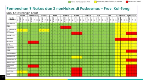 Nakes mencukupi std PMK Ada nakes, blm memenuhi std PMK Belum ada nakes Pemenuhan 9 Nakes dan 2 nonNakes di Puskesmas – Prov. Kal-Teng Kab. Kotawaringin Barat 438