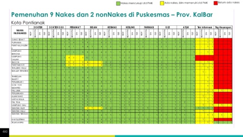 Nakes mencukupi std PMK Ada nakes, blm memenuhi std PMK Belum ada nakes Pemenuhan 9 Nakes dan 2 nonNakes di Puskesmas – Prov. KalBar Kota Pontianak 480