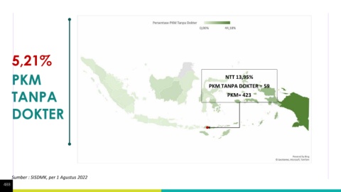 5,21% PKM PKM TANPA DOKTER = 59 NTT 13,95% TANPA PKM= 423 DOKTER Sumber : SISDMK, per 1 Agustus 2022 488