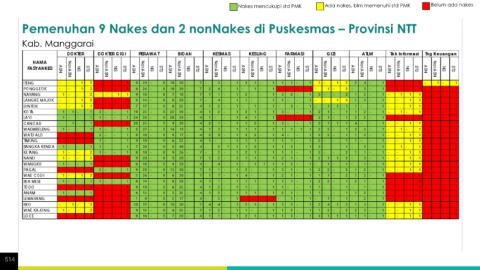 Nakes mencukupi std PMK Ada nakes, blm memenuhi std PMK Belum ada nakes Pemenuhan 9 Nakes dan 2 nonNakes di Puskesmas – Provinsi NTT Kab. Manggarai 514