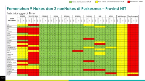 Nakes mencukupi std PMK Ada nakes, blm memenuhi std PMK Belum ada nakes Pemenuhan 9 Nakes dan 2 nonNakes di Puskesmas – Provinsi NTT Kab. Manggarai Timur 520