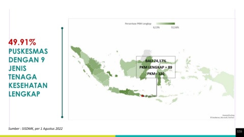 5,21% 49.91% PKM PKM TANPA DOKTER = 0 PUSKESMAS BALI 74,17% BALI 0% DENGAN 9 TANPA PKM= 120 JENIS PKM LENGKAP = 89 PKM= 120 DOKTER TENAGA KESEHATAN LENGKAP Sumber : SISDMK, per 1 Agustus 2022 Sumber : SISDMK, per 1 Agustus 2022 559