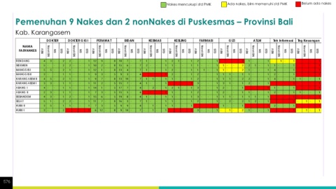 Nakes mencukupi std PMK Ada nakes, blm memenuhi std PMK Belum ada nakes Pemenuhan 9 Nakes dan 2 nonNakes di Puskesmas – Provinsi Bali Kab. Karangasem 576