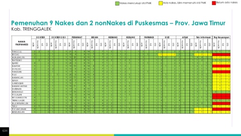 Nakes mencukupi std PMK Ada nakes, blm memenuhi std PMK Belum ada nakes Pemenuhan 9 Nakes dan 2 nonNakes di Puskesmas – Prov. Jawa Timur Kab. TRENGGALEK 634