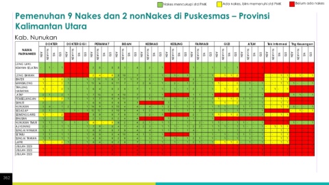 Nakes mencukupi std PMK Ada nakes, blm memenuhi std PMK Belum ada nakes Pemenuhan 9 Nakes dan 2 nonNakes di Puskesmas – Provinsi Kalimantan Utara Kab. Nunukan 362