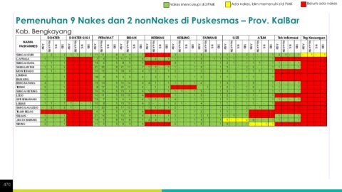 Nakes mencukupi std PMK Ada nakes, blm memenuhi std PMK Belum ada nakes Pemenuhan 9 Nakes dan 2 nonNakes di Puskesmas – Prov. KalBar Kab. Bengkayang 470