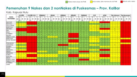 Nakes mencukupi std PMK Ada nakes, blm memenuhi std PMK Belum ada nakes Pemenuhan 9 Nakes dan 2 nonNakes di Puskesmas – Prov. KalBar Kab. Kapuas Hulu 476