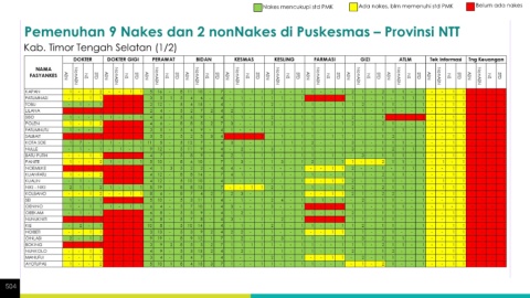 Nakes mencukupi std PMK Ada nakes, blm memenuhi std PMK Belum ada nakes Pemenuhan 9 Nakes dan 2 nonNakes di Puskesmas – Provinsi NTT Kab. Timor Tengah Selatan (1/2) 504