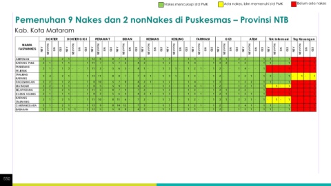 Nakes mencukupi std PMK Ada nakes, blm memenuhi std PMK Belum ada nakes Pemenuhan 9 Nakes dan 2 nonNakes di Puskesmas – Provinsi NTB Kab. Kota Mataram 550