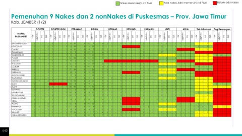 Nakes mencukupi std PMK Ada nakes, blm memenuhi std PMK Belum ada nakes Pemenuhan 9 Nakes dan 2 nonNakes di Puskesmas – Prov. Jawa Timur Kab. JEMBER (1/2) 640