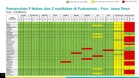 Nakes mencukupi std PMK Ada nakes, blm memenuhi std PMK Belum ada nakes Pemenuhan 9 Nakes dan 2 nonNakes di Puskesmas – Prov. Jawa Timur Kab. JOMBANG 650