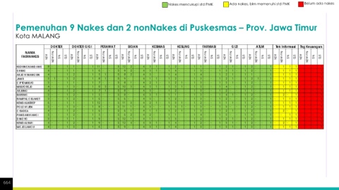 Nakes mencukupi std PMK Ada nakes, blm memenuhi std PMK Belum ada nakes Pemenuhan 9 Nakes dan 2 nonNakes di Puskesmas – Prov. Jawa Timur Kota MALANG 664