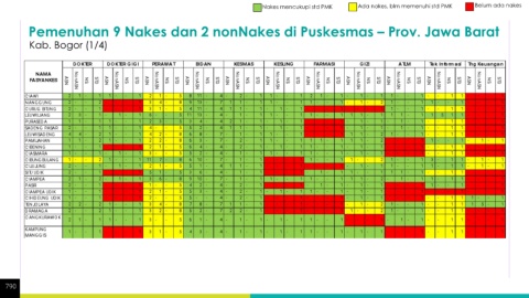 Nakes mencukupi std PMK Ada nakes, blm memenuhi std PMK Belum ada nakes Pemenuhan 9 Nakes dan 2 nonNakes di Puskesmas – Prov. Jawa Barat Kab. Bogor (1/4) 790