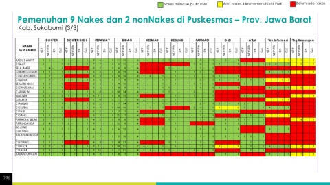 Nakes mencukupi std PMK Ada nakes, blm memenuhi std PMK Belum ada nakes Pemenuhan 9 Nakes dan 2 nonNakes di Puskesmas – Prov. Jawa Barat Kab. Sukabumi (3/3) 796