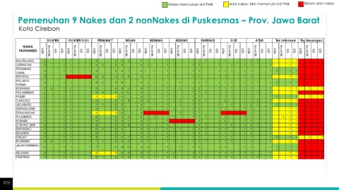 Nakes mencukupi std PMK Ada nakes, blm memenuhi std PMK Belum ada nakes Pemenuhan 9 Nakes dan 2 nonNakes di Puskesmas – Prov. Jawa Barat Kota Cirebon 826