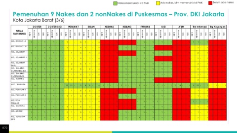 Nakes mencukupi std PMK Ada nakes, blm memenuhi std PMK Belum ada nakes Pemenuhan 9 Nakes dan 2 nonNakes di Puskesmas – Prov. DKI Jakarta Kota Jakarta Barat (3/6) 870