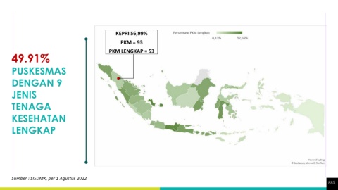 KEPRI 2,15% PKM = 93 KEPRI 56,99% PKM TANPA DOKTER = 2 PKM = 93 5,21% 49.91% PKM LENGKAP = 53 PKM PUSKESMAS DENGAN 9 TANPA JENIS DOKTER TENAGA KESEHATAN LENGKAP Sumber : SISDMK, per 1 Agustus 2022 Sumber : SISDMK, per 1 Agustus 2022 885