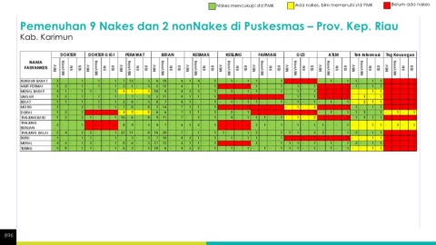 Nakes mencukupi std PMK Ada nakes, blm memenuhi std PMK Belum ada nakes Pemenuhan 9 Nakes dan 2 nonNakes di Puskesmas – Prov. Kep. Riau Kab. Karimun 896