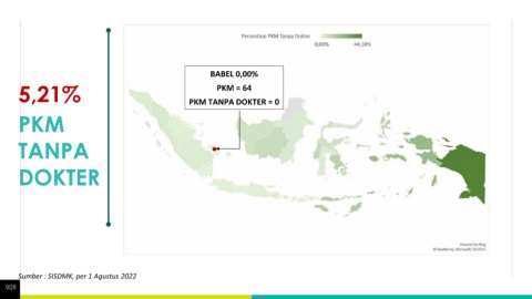 BABEL 0,00% 5,21% PKM TANPA DOKTER = 0 PKM = 64 PKM TANPA DOKTER Sumber : SISDMK, per 1 Agustus 2022 908