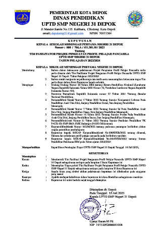 Menimbang 1. Bahwa dalam kelancaran pelaksanaan Projek Penguatan Profil Pelajar Pancasila maka