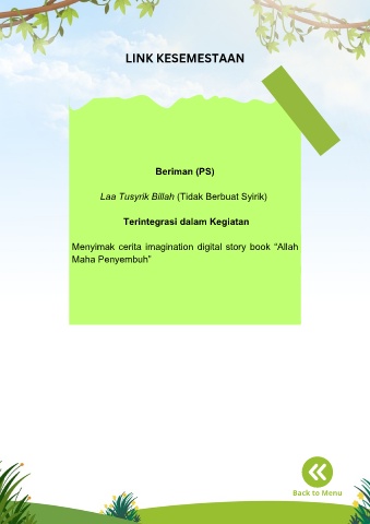LINK KESEMESTAAN Beriman (PS) Laa Tusyrik Billah (Tidak Berbuat Syirik) Terintegrasi dalam Kegiatan Menyimak cerita imagination digital story book “Allah Maha Penyembuh” Back to Menu