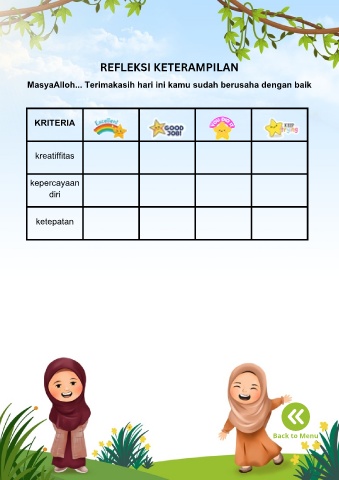 REFLEKSI KETERAMPILAN MasyaAlloh... Terimakasih hari ini kamu sudah berusaha dengan baik KRITERIA kreatiffitas kepercayaan diri ketepatan Back to Menu
