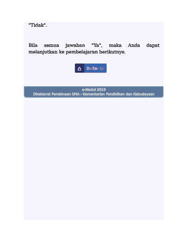 "Tidak". Bila semua jawaban "Ya", maka Anda dapat melanjutkan ke pembelajaran berikutnya. ⌂ ⌂ Daftar Isi Daftar Isi e-Modul 2019 Direktorat Pembinaan SMA - Kementerian Pendidikan dan Kebudayaan