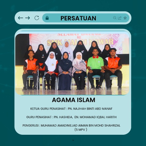 PERSATUAN AGAMA ISLAM KETUA GURU PENASIHAT : PN. NAJIHAH BINTI ABD MANAF GURU PENASIHAT : PN. HASHIDA, EN. MOHAMAD IQBAL HARITH PENGERUSI : MUHAMAD AMADINIEJAD AIMAN BIN MOHD SHAHRIZAL (5 MPV ) 70