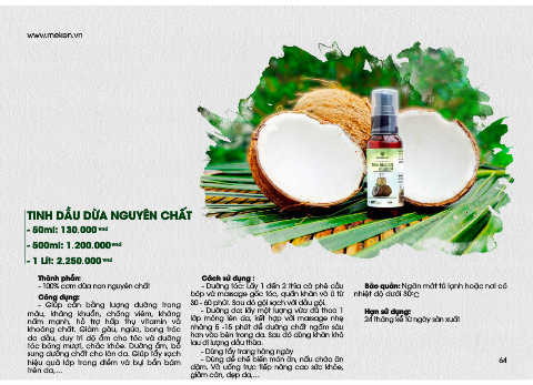 - 100% cơm dừa non nguyên chất - Dưỡng tóc: Lấy 1 đến 2 thìa cà phê dầu Bảo quản: Ngăn mát tủ lạnh hoặc nơi có