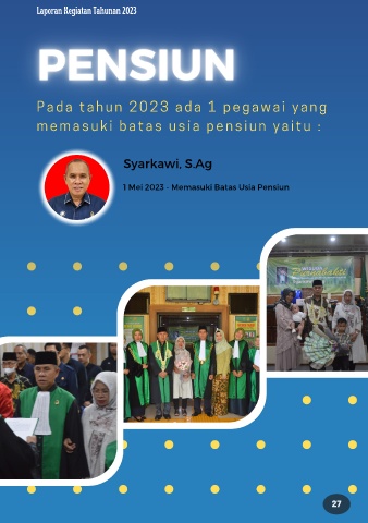 Laporan Kegiatan Tahunan 2023 P a d a t a h u n 2 0 2 3 a d a 1 p e g a w a i y a n g m e m a s u k i b a t a s u s i a p e n s i u n y a i t u : Syarkawi, S.Ag 1 Mei 2023 - Memasuki Batas Usia Pensiun 27