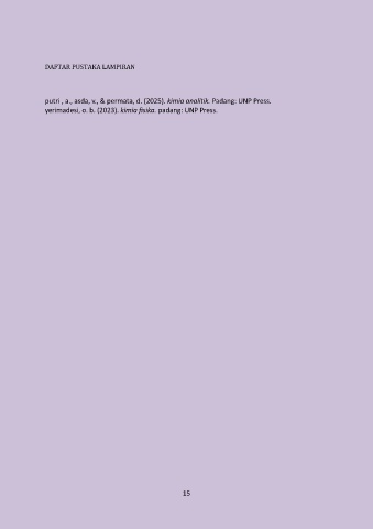 DAFTAR PUSTAKA LAMPIRAN putri , a., asda, v., & permata, d. (2025). kimia analitik. Padang: UNP Press. yerimadesi, o. b. (2023). kimia fisika. padang: UNP Press. 15