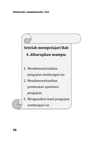 Destructive Nondestructive Test Setelah mempelajari Bab 4, diharapkan mampu: 1. Mendemonstrasikan pengujian sambungan las 2. Mendemonstrasikan pembuatan spesimen pengujian 3. Menganalisis hasil pengujian sambungan las 70