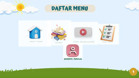 DAFTAR MENU DAFTAR MENU MENU UTAMA VIDEO PEMBELAJARAN SOAL TES MENU UTAMA SOAL TES VIDEO PEMBELAJARAN MATERI MATERI BIODATA PENULIS BIODATA PENULIS 1