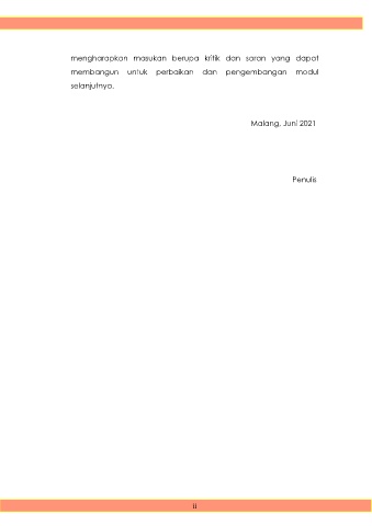 mengharapkan masukan berupa kritik dan saran yang dapat membangun untuk perbaikan dan pengembangan modul selanjutnya. Malang, Juni 2021 Penulis ii