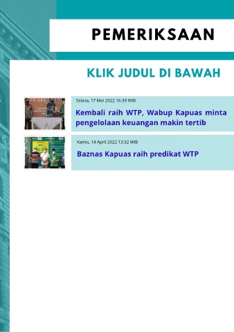 PEMERIKSAAN KLIK JUDUL DI BAWAH Selasa, 17 Mei 2022 16:39 WIB Kembali raih WTP, Wabup Kapuas minta pengelolaan keuangan makin tertib Kamis, 14 April 2022 13:32 WIB Baznas Kapuas raih predikat WTP