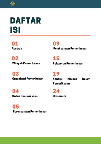 DAFTAR ISI 01 09 Abstrak Pelaksanaan Pemeriksaan 02 15 Wilayah Pemeriksaan Pelaporan Pemeriksaan 03 19 Organisasi Pemeriksaan Kondisi Khusus Dalam Pemeriksaan 04 24 Siklus Pemeriksaan Glosarium 05 Perencanaan Pemeriksaan
