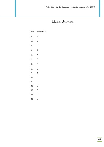 Buku Ajar High Performance Liquid Chromatography (HPLC) KUNCI JAWABAN NO JAWABAN 1. A 2. D 3. D 4. A 5. A 6. D 7. C 8. C 9. A 10. B 11. D 12. B 13. B 14. D 15. B 64
