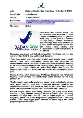 Judul : Sebelum Gunakan Obat Herbal Covid 19, Cek Dulu Di BPOM