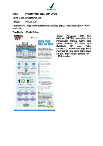 Judul : Vaksin Pfizer dapat EUA BPOM