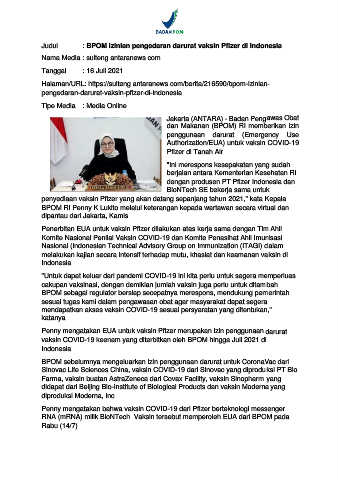 Judul : BPOM izinlan pengedaran darurat vaksin Pfizer di Indonesia