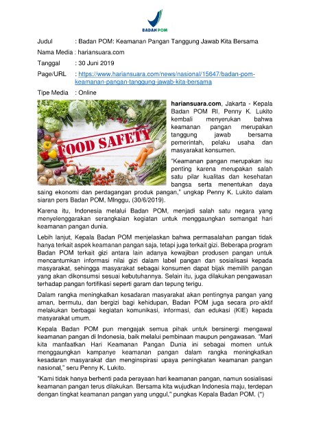 Judul : Badan POM: Keamanan Pangan Tanggung Jawab Kita Bersama
