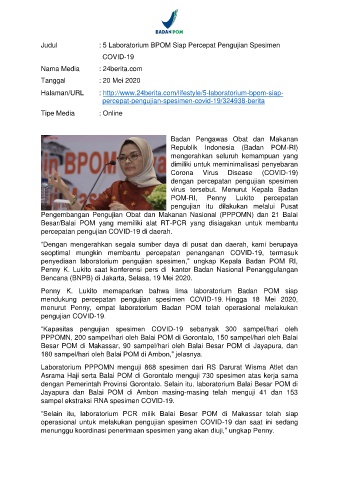 Judul : 5 Laboratorium BPOM Siap Percepat Pengujian Spesimen