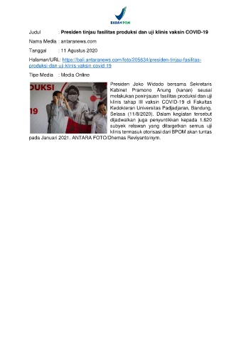 Judul : Presiden tinjau fasilitas produksi dan uji klinis vaksin COVID-19