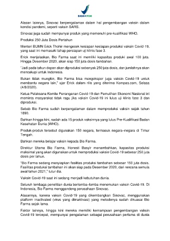 Alasan lainnya, Sinovac berpengalaman dalam hal pengembangan vaksin dalam