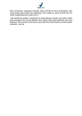 Diah menuturkan, sosialisasi terhadap vaksin COVID-19 harus disampaikan oleh