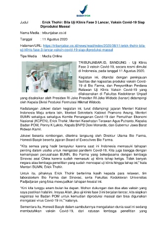 Judul : Erick Thohir: Bila Uji Klinis Fase 3 Lancar, Vaksin Covid-19 Siap