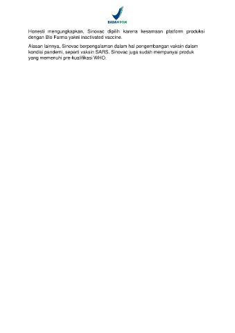 Honesti  mengungkapkan,  Sinovac  dipilih  karena  kesamaan  platform  produksi