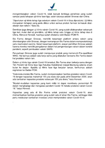 “Diperlukan uji klinis tahap tiga sebelum vaksin Covid-19 ini bisa diproduksi. Uji klinis