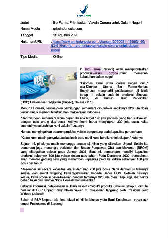 Judul : Bio Farma Prioritaskan Vaksin Corona untuk Dalam Negeri